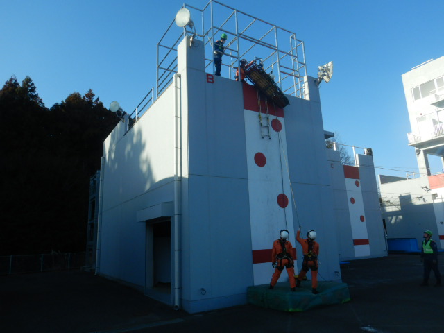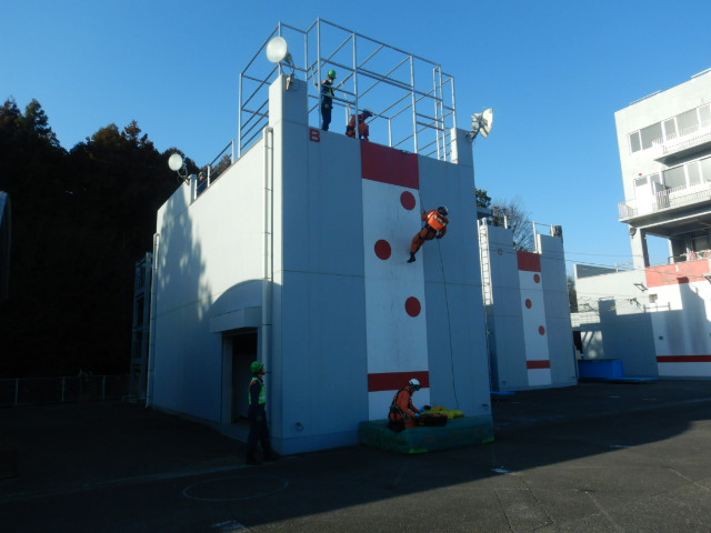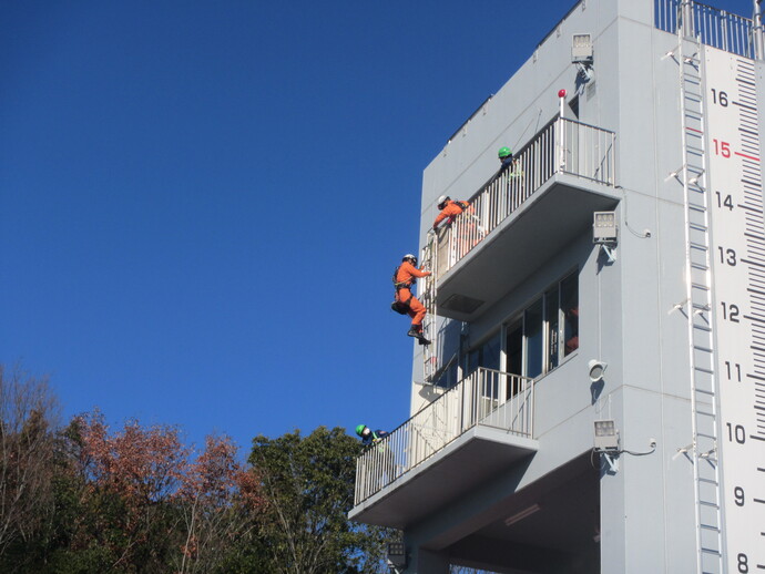 この訓練は、救助現場において要救助者を安全、確実、迅速に救出するための知識、技術及び連携能力の向上を図るとともに、救助隊の練度と能力の確認をすることを目的とし、かぎ付きはしごを活用した高所又は低所救助想定とした内容で実施しました。