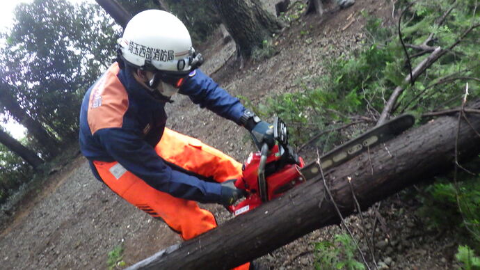 令和3年7月、入間市にある青少年活動センターの敷地内を借用し、チェーンソーの取り扱い訓練を実施しました。