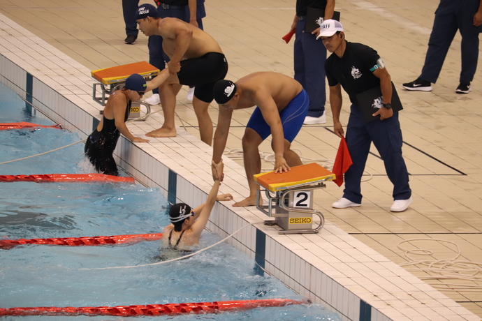 令和5年7月13日に茨城県ひたちなか市山新スイミングアリーナで第51回消防救助技術関東地区指導会(水上の部)が開催されました。入間消防署から個人種目2名、連携種目2チームが出場し、隊員1名の全国大会出場が決まりました。
