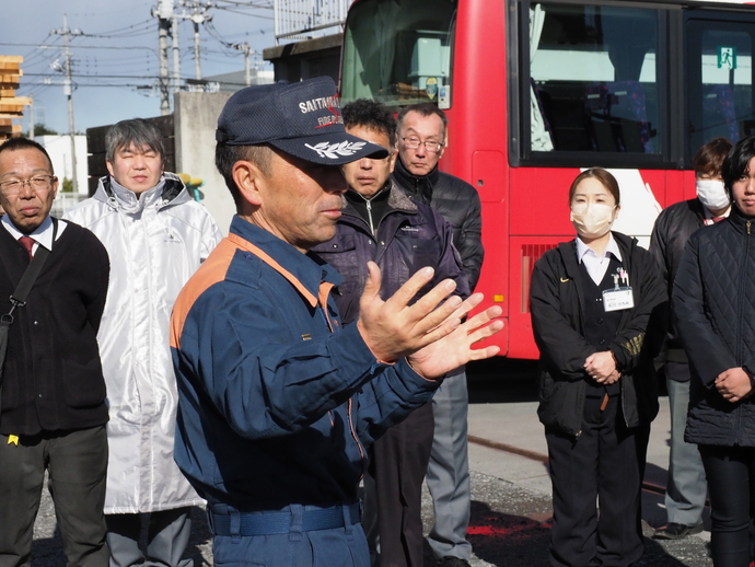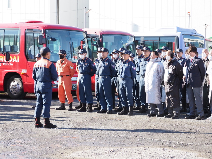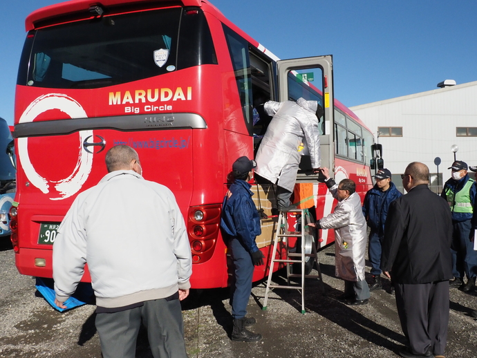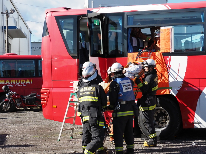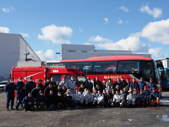 令和7年12月26日(金曜日)に丸大観光敷地内で大型バスの交通事故による火災や多数傷病者に対応する訓練を実施しました。
