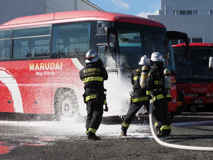 訓練実施者は丸大観光株式会社職員、入間消防署、藤沢分署及び西武分署の隊員です。