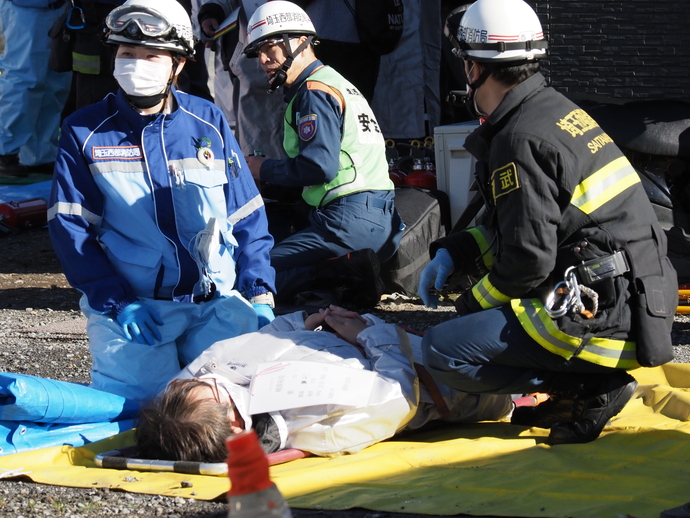 火災に対してはキャフス(圧縮空気泡消火装置)を活用した消火を実施し、多数傷病者に対しては避難誘導、救出及びトリアージを実施しました。
