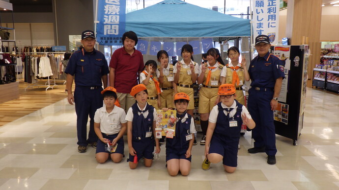 入間市消防少年団では、救急医療週間に伴いイオンスタイル入間において、ティッシュなどのPR品を配布し、来客者に対し救急車の適正利用等について呼びかけました。たくさんの方に関心を持ってもらい、とても有意義な活動となりました。