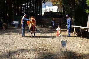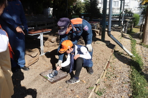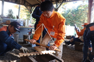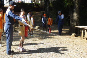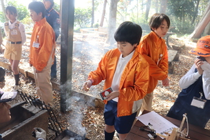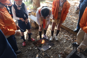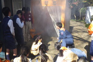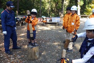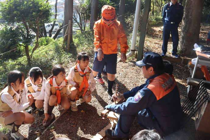 第4回の活動は、入間市青少年活動センターで実施しました。前半は、座学で「火の科学・消火原理」の内容で煙の恐ろしさや特性、電池、リチウムイオン電池の発火実験などを行い、後半は屋外での活動となり、消火器を使って初期消火訓練や薪割体験、火起こし体験を行いました。