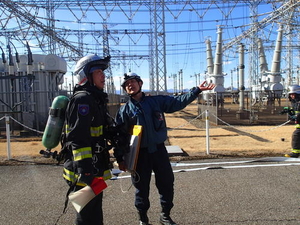 変電所内の変圧器から出火したという想定で、現場到着後の初動対応から、実際に放水を行い消火、鎮火までの活動を行いました。活動訓練後は、訓練を振り返り、東京電力職員、消防の意見交換を行い、最後に変電所内の設備を見学させて頂きました。