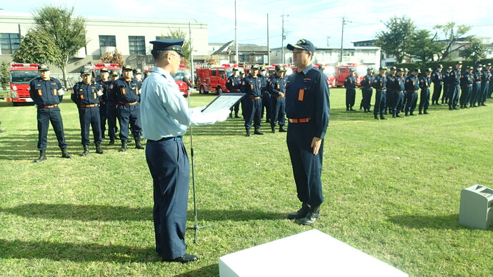 令和7年9月24日(水曜日)午前11時50分頃に所沢市大字山口地内のゴルフ場コース内で発生したその他火災において、ゴルフ場従業員と協力して有効な初期消火活動を行ったことに対し、所沢中央消防署長から感謝状が贈呈されました。