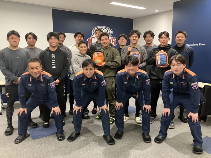 当日は、「地震発生に伴い、若獅子寮3階食堂厨房から火災が発生し、屋上に逃げ遅れがいる」との想定で訓練が行われ、新入団選手による避難訓練と所沢中央消防署高度救助隊がはしご車を使用し、建物屋上にいる要救助者の救出訓練を行いました。その後、新入団選手は初期消火訓練と心肺蘇生法の講習を行い、防火・防災・救命について知識、技術の習得が図れました。