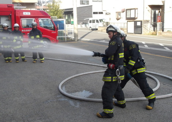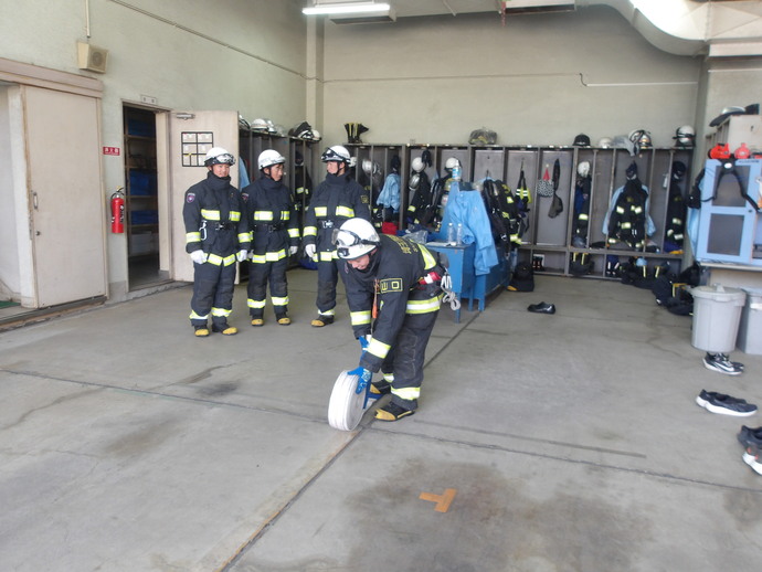 2日目は、訓練礼式を学び、車両や資器材の説明を受けた後、消防ホースの延長訓練や空気呼吸器着装訓練など消防士としての基礎的な訓練を行い、最後は放水訓練を行いました。