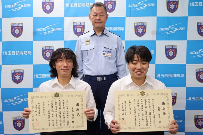 傷病者の男性は、救急隊等が到着する直前に自発呼吸を再開し、わずかに発語が出来る状態まで回復しました。救急車での搬送中も容体変化はなく、病院収容後は後遺症なく社会復帰を果たしており、バイスタンダーである両名の適切かつ迅速な救命処置は男性の社会復帰に大きく貢献したものとして、その功労を称え消防長から感謝状が贈呈されました。