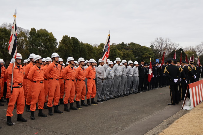 今回の消防出初式では、消防職員253人、消防団員137人、消防車両24台、消防団車両10台が参加し、多くの御来賓の皆様や地域住民の方々、約2,200人が来場するなど、盛大に行われました。