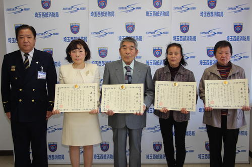 平成29年3月17日12時35分頃、所沢市中富地内の墓地において発生した火災に際し、 異変に気づいた旭寝具株式会社の高木甫氏、 高木美江氏、安田アサ氏、古川文子氏、火災現場に居合わせた小林岳史氏の5名により、迅速な119番通報及び初期消火が行われました。